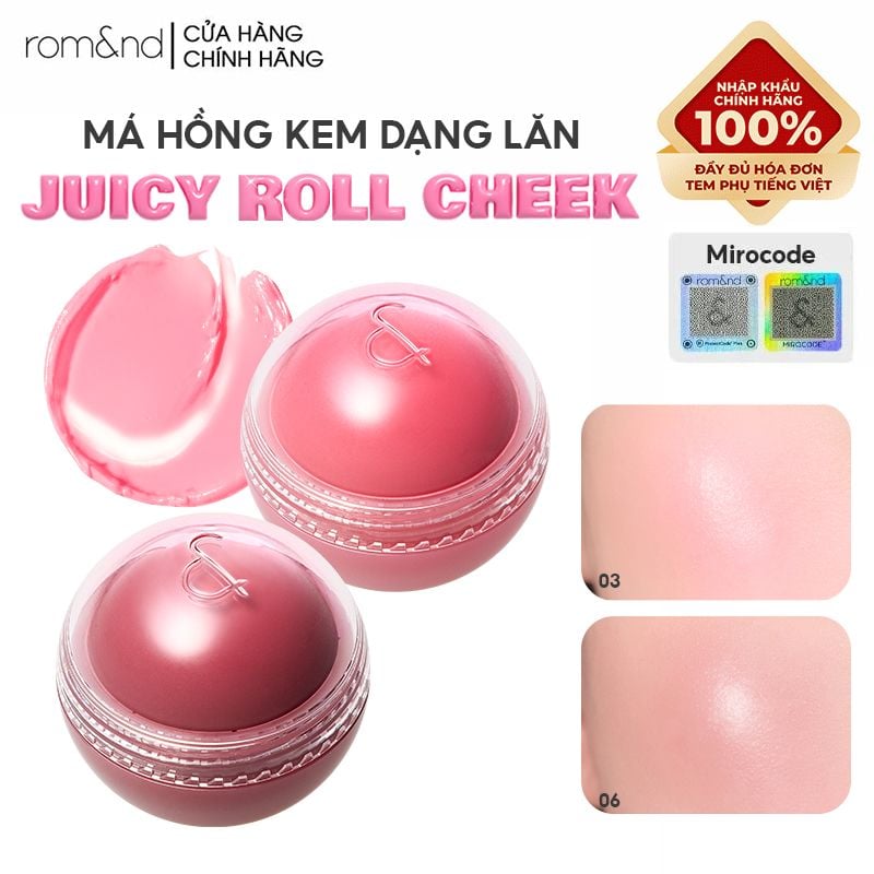 Romand Juicy Roll Cheek của Rom&nd là má hồng dạng kem với thiết kế đầu lăn độc đáo, giúp tạo hiệu ứng gò má căng bóng và tươi tắn tự nhiên. Sản phẩm có kết cấu kem mịn nhẹ, dễ tán.