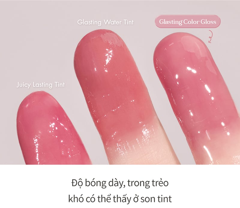 Romand Glasting Color Gloss có kết cấu son bóng mịn mượt, dễ tán và ôm đều bề mặt môi. Khi thoa tạo lớp bóng trong trẻo giúp môi trông đầy đặn và mềm mại hơn.