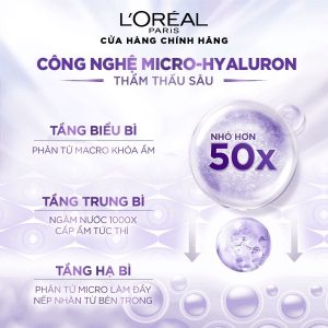 - Hyaluronic Acid: Serum L’Oreal Cấp ẩm, Cải Thiện Nếp Nhăn hiện nay đã có thành chủ chốt là HA (Hyaluronic Acid) có khả năng giữ nước gấp 600 đến 100 lần trọng lượng của mình tương đương 1gr HA có khả năng cung cấp 6 lít nước từ đó duy trì được độ ẩm và tạo ra lớp dưỡng ẩm bảo vệ độ ẩm cho da.