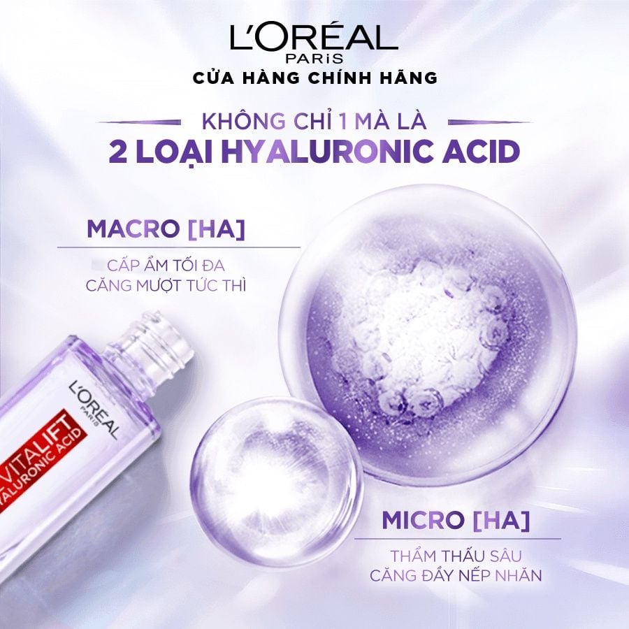 - 2 loại HA: L’Oreal Revitalift 1.5% Hyaluronic Acid Serum chứa 2 loại HA là Macro và Micro.